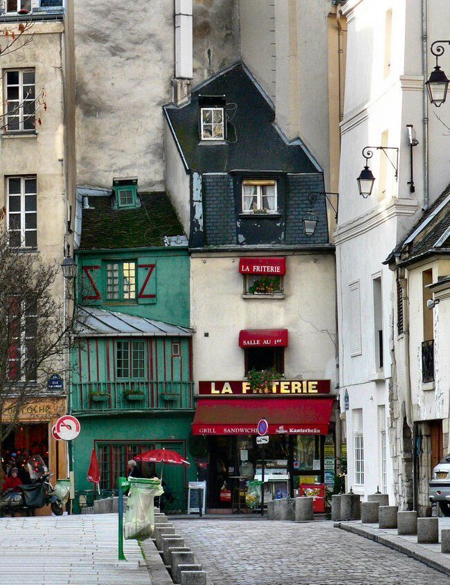 Ресторанчик на последнем снимке называется «Кот-рыболов» — по имени соседней улочки, которая знаменита тем, что является самой узкой в Париже — ее ширина всего 1.8 метра.