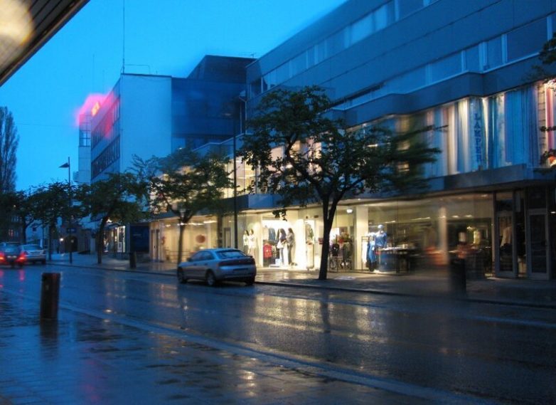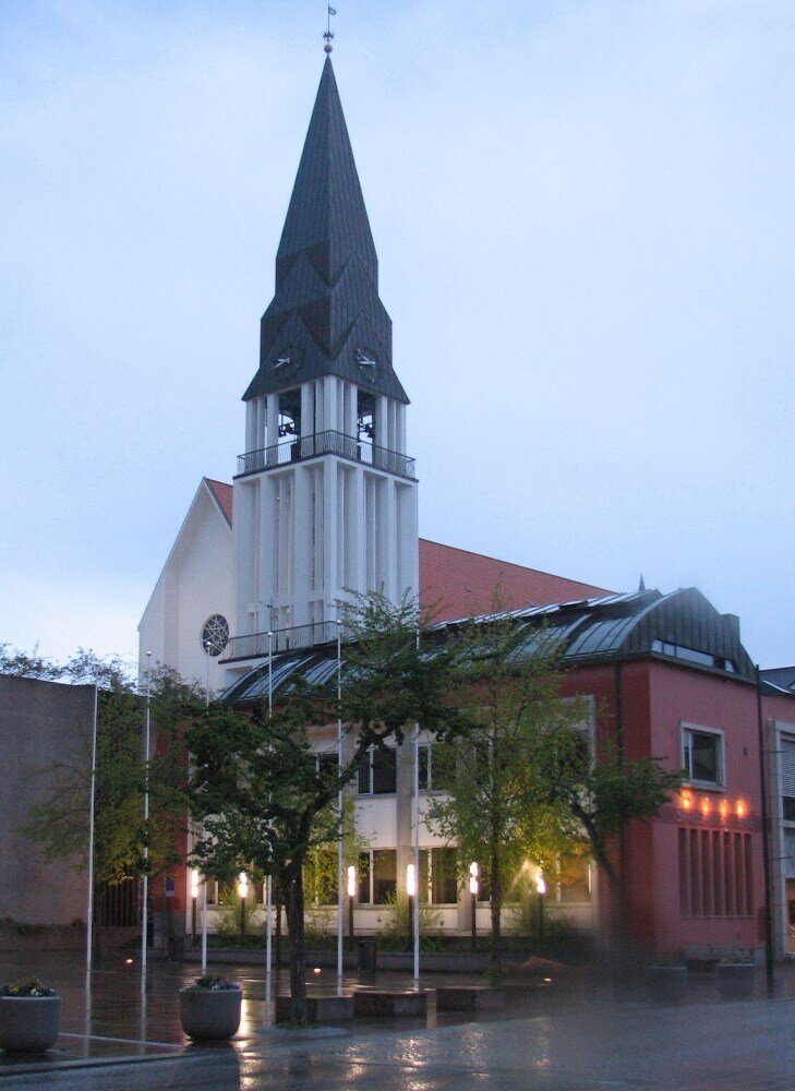 С неба льёт как из ведра, на объектив фотоаппарата самое время ставить дворники, и фотографии вечернего Мольде зачастую напоминают полотна импрессионистов. Мольде – небольшой городок на побережье. Центр города сильно пострадал в ходе Второй Мировой войны, поэтому сейчас повсюду превалирует современная застройка. Церковь и автовокзал: