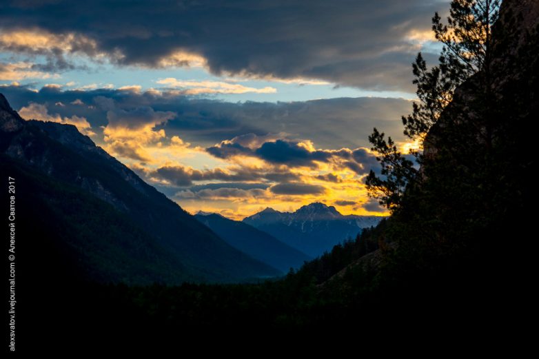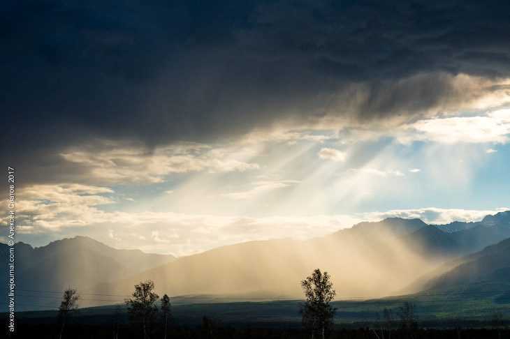 Вот такой интересной лампой встретил нас хребет при въезде в долину Алла в Бурятии. Косые лучи солнца вкупе с косым дождём рисовали картину в небе.