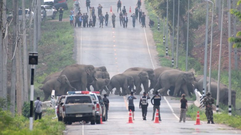 В Таиланде полицейским пришлось остановить движение на автотрассе, чтобы стало из 50 слонов могло безопасно перейти на другую сторону, апрель 2020