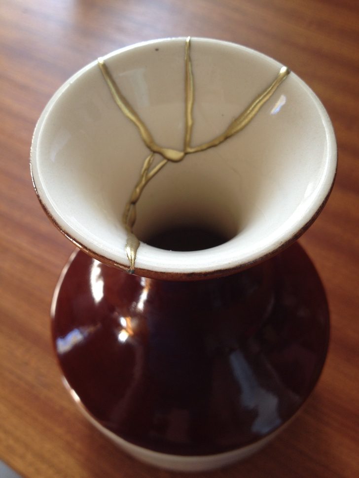 Кинцуги — искусство реставрации разбитой посуды с помощью специального клея, смешанного с золотом. Трещины при этом не скрываются, а выставляются напоказ, а изделие становится уникальным. «Искусство золотого шва» учит нас принимать себя со своими недостатками и превращать их в красоту.
