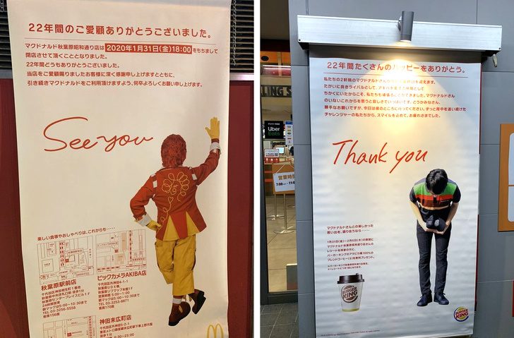 1. Уважение к конкурентам. В Токио закрылся один из «Макдоналдсов». Соседний Burger King баннером поблагодарил его за годы конкуренции