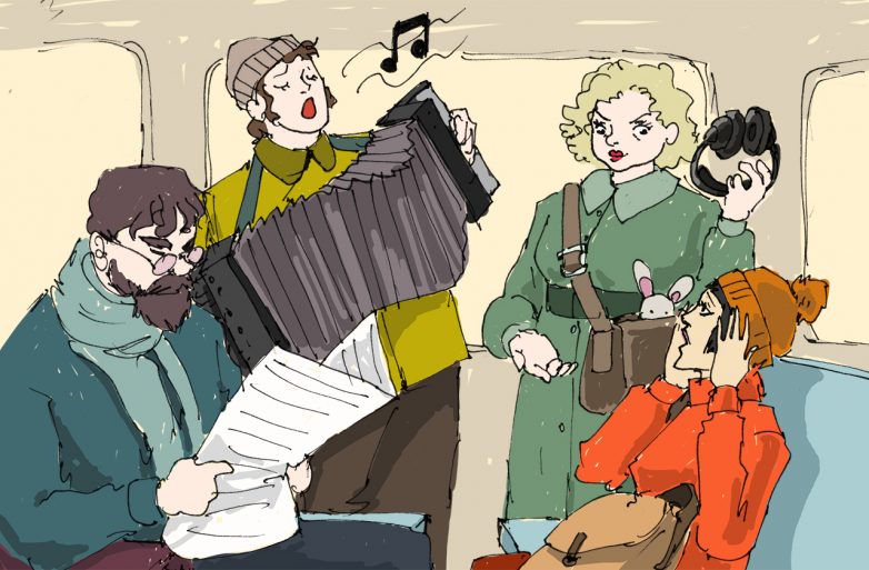 На каждой скамейке сидит по три-четыре человека, и сиденья расположены так близко, что, неловко махнув рукой, можно ударить соседа напротив. Но вы должны быть благодарны, что у вас есть место! Поезда настолько переполнены, что множество людей стоят во время поездки. Будьте готовы к тому, что обязательно окажетесь зажатым между старой бабушкой, которая, вероятно, едет на дачу, и пьяным, который наверняка уснет у вас на плече. При этом не забывайте наслаждаться поездкой! Когда поезд покинет станцию, у вас будет возможность купить не только воду и закуски, но и всякие побрякушки, с которыми пробиваются по вагонам торговцы с сумками. <...> Путешествующие продавцы — это только часть развлечений в электричке. Позже по вагонам наверняка будут бродить музыканты, играющие на гитарах и аккордеонах. <...> Это звучит как предостережение, но на самом деле будет весело!