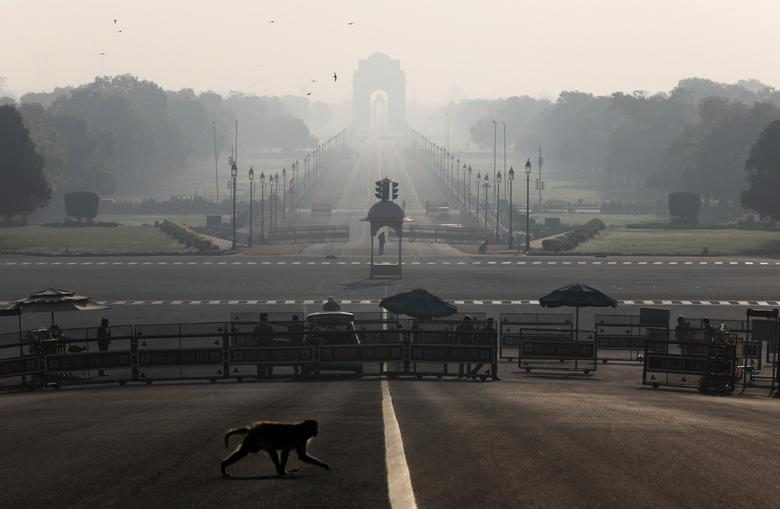Обезьяна пересекает дорогу возле Президентского дворца Индии во время 14-часового комендантского часа в Нью-Дели.
