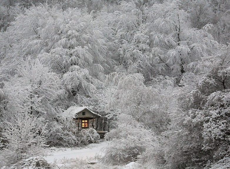 Охотничий домик в зимнем лесу.