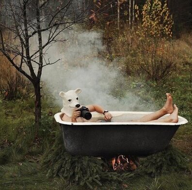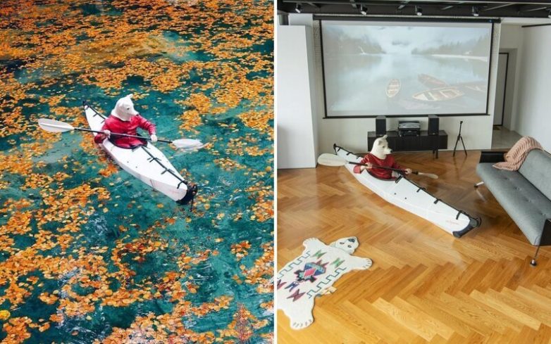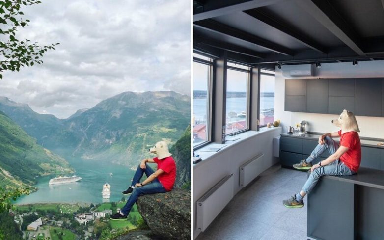 Пермский блогер с головой медведя решил воссоздать свои фотографии из путешествий не выходя из дома
