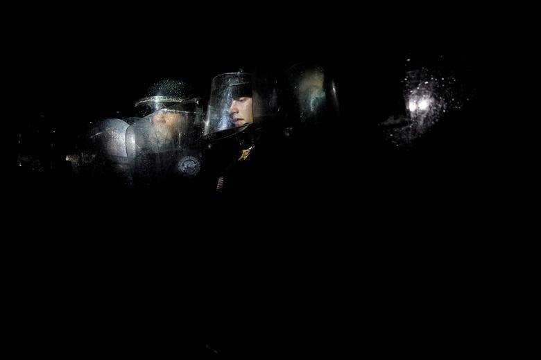 Офицеры секретной службы США стоят перед демонстрантами перед Белым домом в парке Лафайет в Вашингтоне.
