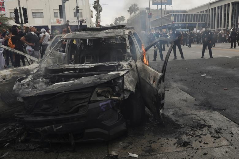 Полицейская машина полиции Нью-Йорка подожжена во время столкновения демонстрантов с полицией во время марша против гибели Джорджа Флойда.
