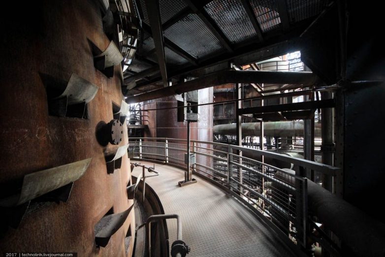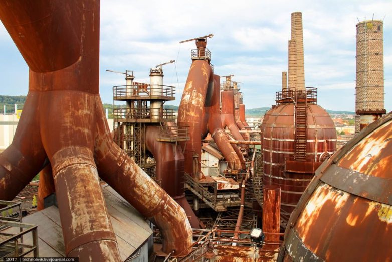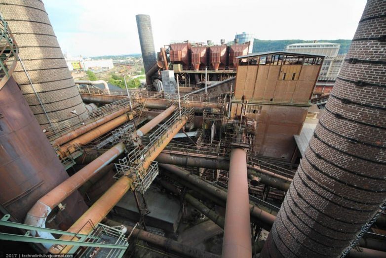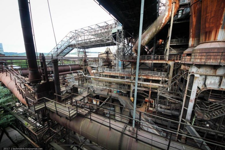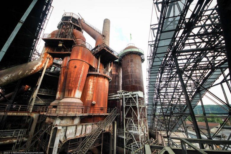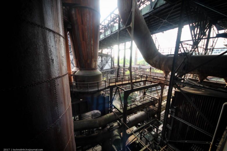 Сами доменные печи увидеть снаружи не получится, так как они окружены со всех сторон воздухонагревателями, трубами и прочими конструкциями. Каркасная конструкция справа в кадре — наклонный подъемник для вагонеток подвесной дороги, по которому вагонетки с шихтой поднимались на уровень доменных печей.