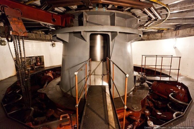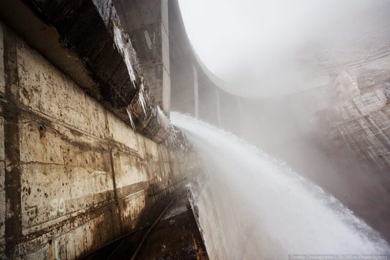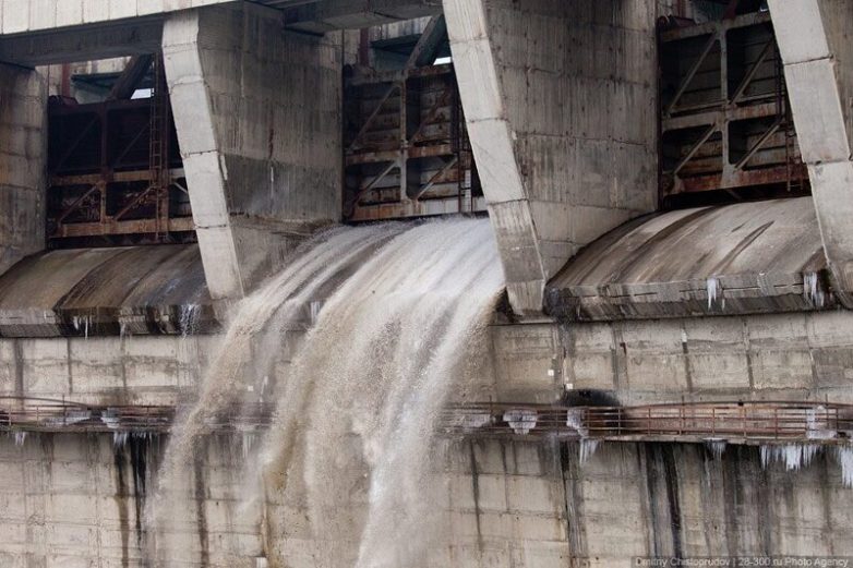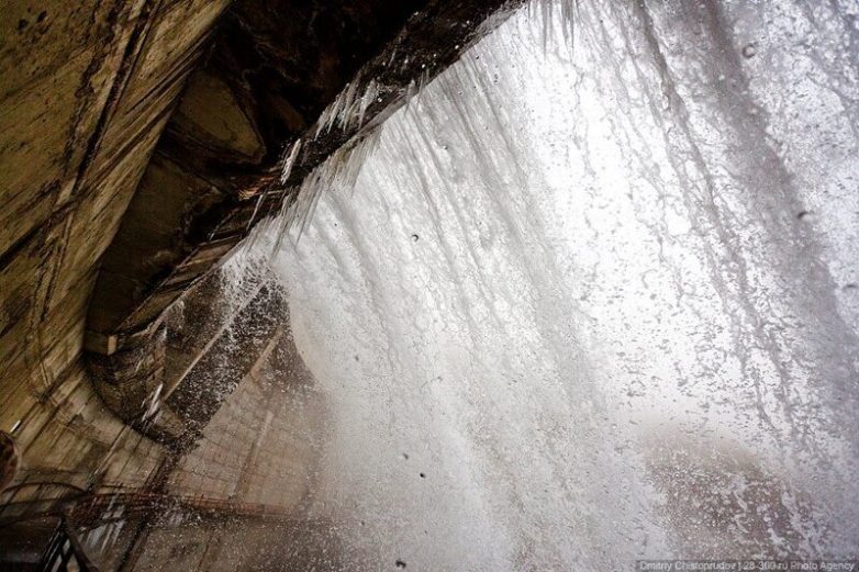 А так выглядит начало работы холостого водосброса. Кран всего на несколько сантиметров приподнял многотонный металлический затвор, и появился 70-метровый водопад: