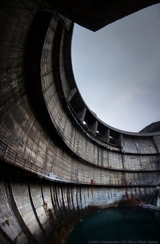 Знакомьтесь, бетонная арочная плотина высотой 86.5 метров. Это как 28-этажный дом. Длина по гребню — 179 метров (почти как два футбольных поля). Внизу воды очень мало, потому что в это время года весь поток проходит через гидроагрегаты, и холостой (паводковый) водосброс закрыт.