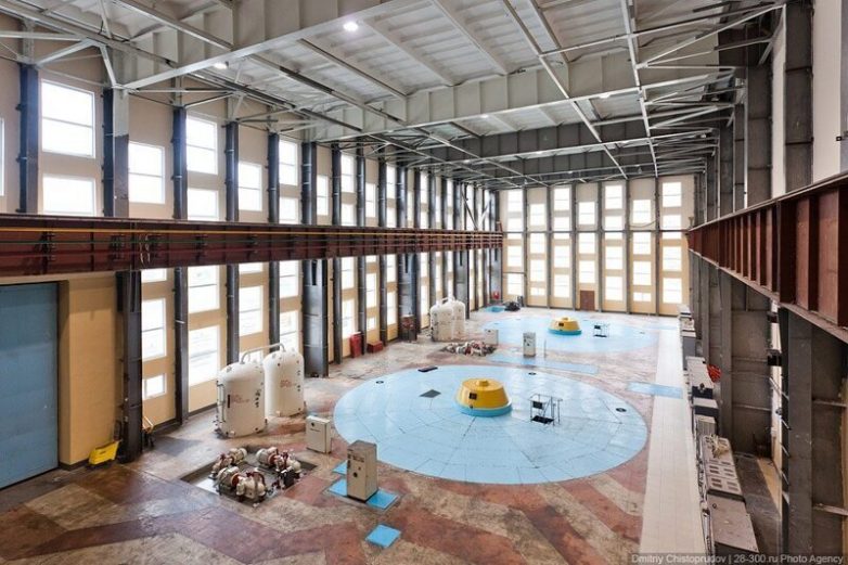 Машинный зал. В здании ГЭС установлено 2 гидроагрегата мощностью по 110 МВт, работающих при расчётном напоре 46 метров.