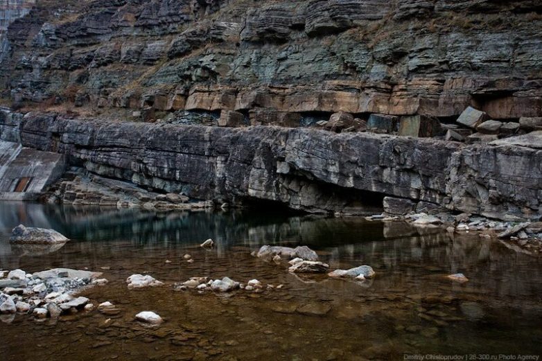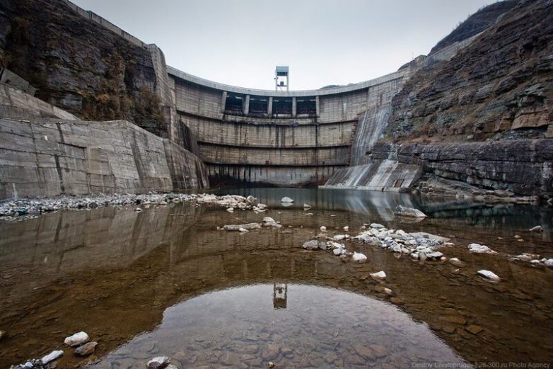 В полутора километрах от нас в ущелье находится арочная плотина. Добраться до нее можно только вплавь или пробраться сквозь гору: