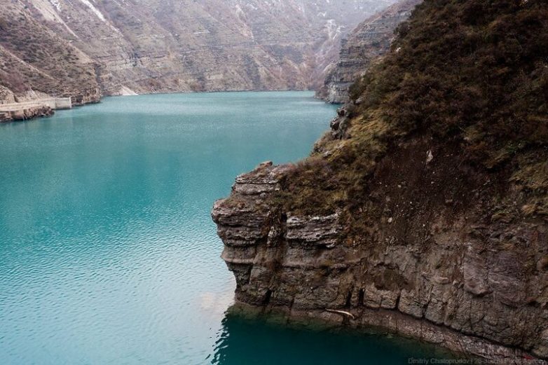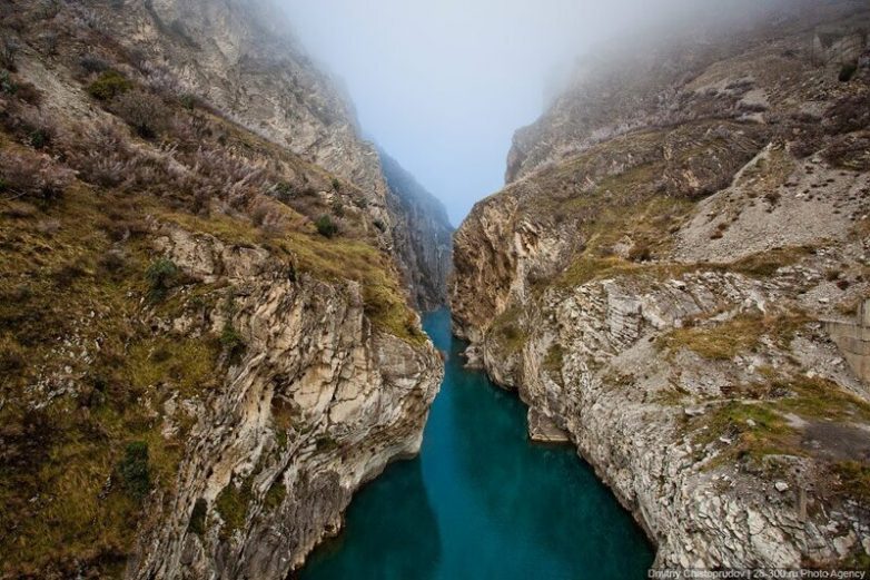 Вода Сулака. Она бирюзовая и чем больше её глубина — тем сильнее она отдает сине-зелёным цветом. Для людей, не видевших это вживую, это кажется баловством с фотошопом. Но всё же это её действительный цвет. Такого цвета воду можно встретить на очень многих горных реках, питающихся ледниками. Бирюзовый цвет воде дают взвешенные частицы голубой глины. Вот и всё объяснение:
