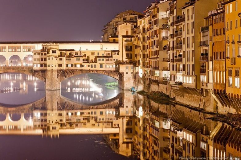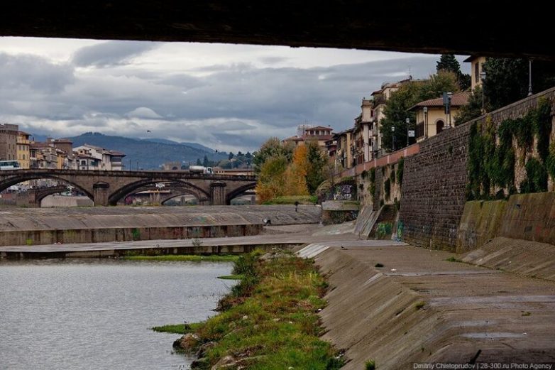 Жилые дома облепили весь берег и перебрались на старейший мост Флоренции — Понте Веккьо. Мост был построен в 1345 году и представляет из себя прочную и в то же время изящную конструкцию из трех арок. Отличительная черта Понте Веккьо — дома, теснящиеся по обеим его сторонам: