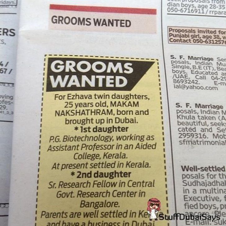 Объявление в газете о поиске женихов для двух сестер-близняшек. Здесь говорится, что одна — биотехнолог, работает ассистентом профессора в Керале, а вторая — старший научный сотрудник в Центральном государственном исследовательском центре в Бангалоре. Внизу приписка: родители хорошо устроились в Керале и владеют бизнесом в Дубае.