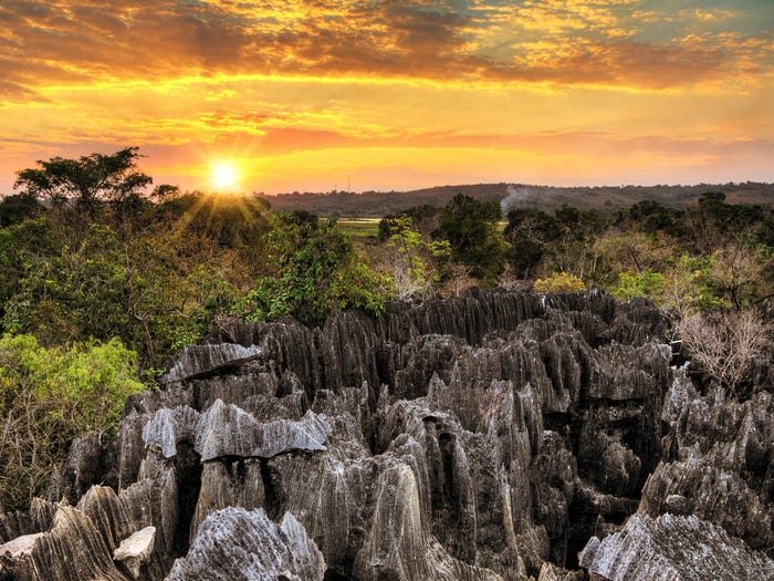 Цинги, мадагаскарский «каменный лес», предлагает один из самых уникальных ландшафтов в мире — пересеченную местность, характеризующуюся карстовыми образованиями, пористыми известняками, которые были вырезаны в течение долгого времени дождевыми осадками.