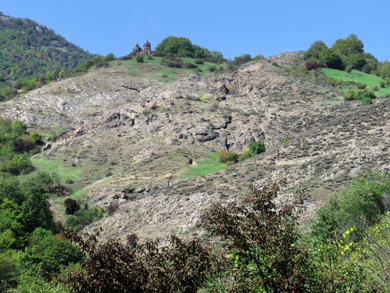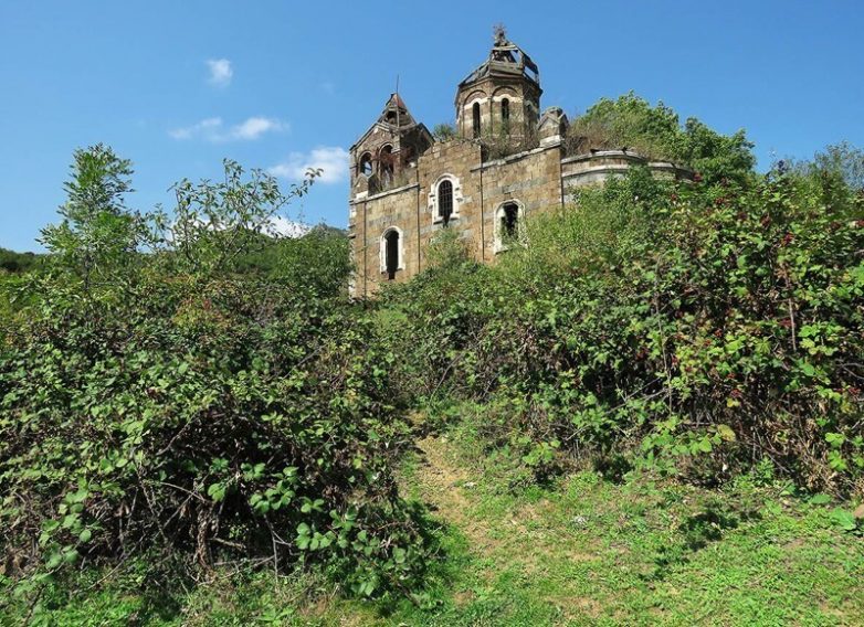 Церковь Святого Харлампия (1865) не армянская, а православная, если точнее — греческая, и построил её, как можно догадаться из посвящения, Харлампик Кундуров, больше всех преуспевший в разработке здешних руд. Теперь стоит она на сотни метров выше последних жилых домов, и путь к ней крутой да тернистый. Или точнее ежевичестый — от упомянутой траншеи вверх по склону лезть ещё добрых полчаса, а вокруг храма, натурально, укрепрайон, в котором ежевика заменяют колючую проволоку. Храм совершенно заброшен, внутри него коровы прячутся от жары и усыпают пол навозом, но высоко на горе, в одиночестве, здесь сквозь любой навоз проступают покой и святость: