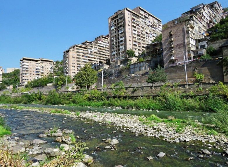 Между ними уходит неожиданно живописная улица Туманяна, застроенная туфовыми сталинками, но извилистая и узкая, как в старых европейских городах. За поворотом скрывается стадион «Гандзасар» (до 2008 «Лернагорц», и я кажется в состоянии сам перевести это слово — «Горняк») на фоне серной язвы горной выработки в склоне горы.