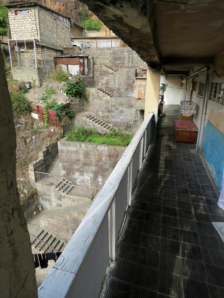 И тут самое главное вовремя остановиться — выход на улицу выше по склону имеет только один, и далеко не самый верхний этаж. В отличие от всех остальных этажей с обычными лестничными клетками, он представляет собой сквозной коридор от подъезда к балкону: