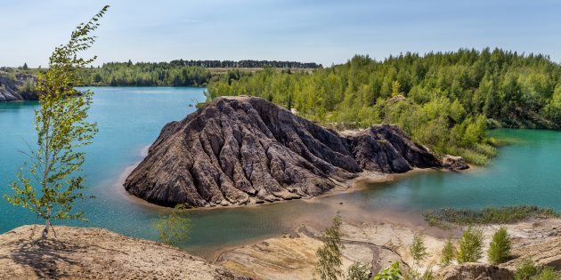 Романцевские горы созданы не природой, а человеком — в 60‑е годы прошлого века тут был карьер по добыче бурого угля. Его окончательно закрыли в 90‑х, а дальше уже за дело взялись дожди и снега. В итоге сегодня мы видим почти инопланетный пейзаж: чёрные склоны, озёра с разноцветной водой, скрученные ветром деревья.