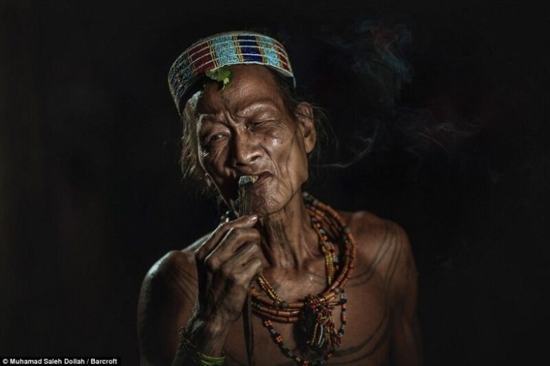 Воин народа ментавайцев в традиционном головном уборе и украшениях курит папиросу.
