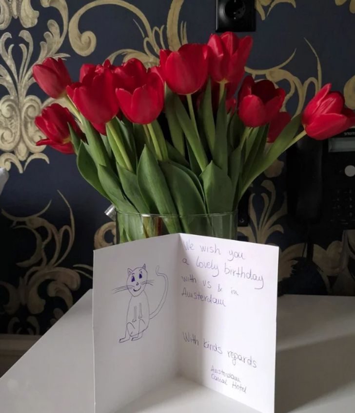 «Отмечала свой день рождения в Амстердаме. Работники отеля спросили, что написать в открытке по этому поводу. Я попросила нарисовать котика. Замечательный котик вышел — под стать городу»
