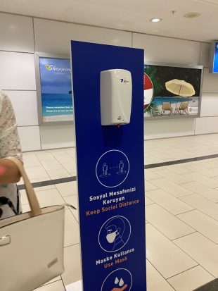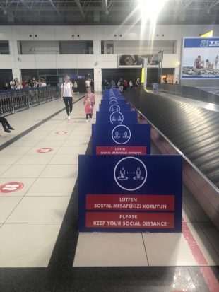 В аэропорту Антальи, ещё до паспортного контроля, сотрудники просвечивают туристов тепловизором, прикрикивая «Маска, маска!», и просят вставать в очередь к офицеру согласно разметке на полу.