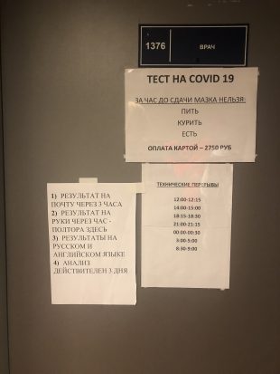 Проходит всё примерно так. Занимаешь очередь. Если повезёт, ждёшь в тесной каморке среди толпы прилетевших, а не на холоде. Берёшь анкеты на каждого члена семьи и заполняешь от руки. Согласно инструкции, заходишь на определённый сайт и там регистрируешься на проведение теста («Ну кто это придумал?!» — жалуется каждый второй). Дожидаешься очереди — впускают по восемь человек. Перед входом в кабинет весь багаж сканируется. Наконец, оказываешься в кабинете и медсестра палочкой забирает биоматериал из носа.