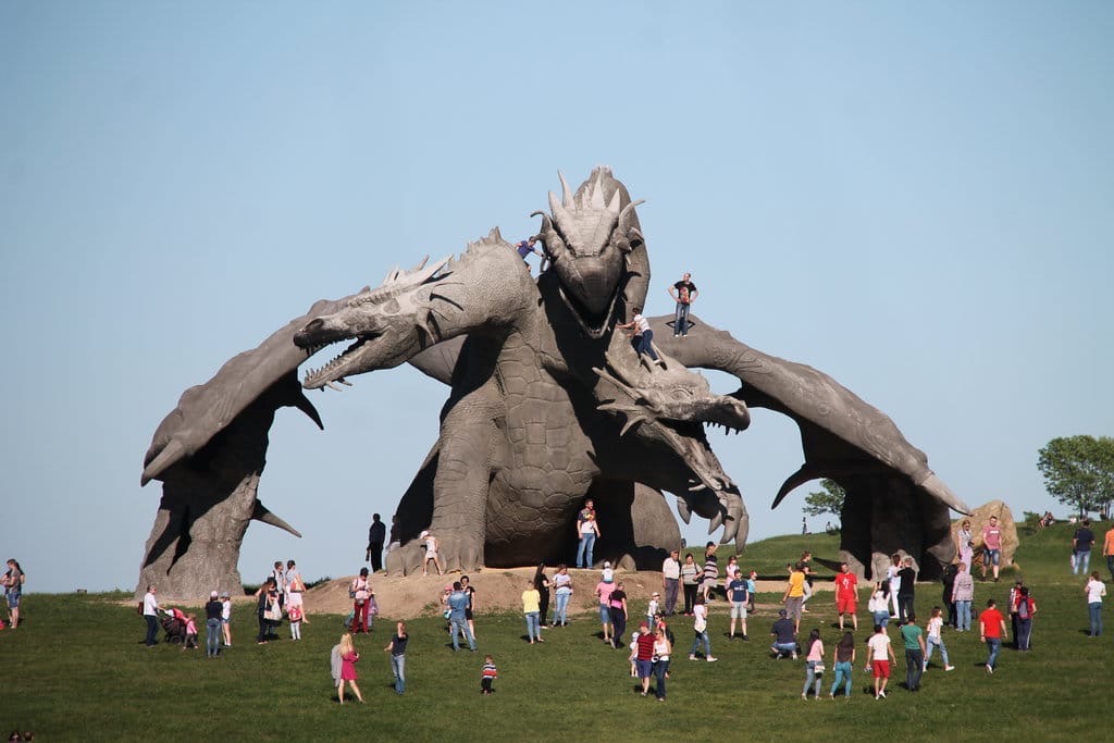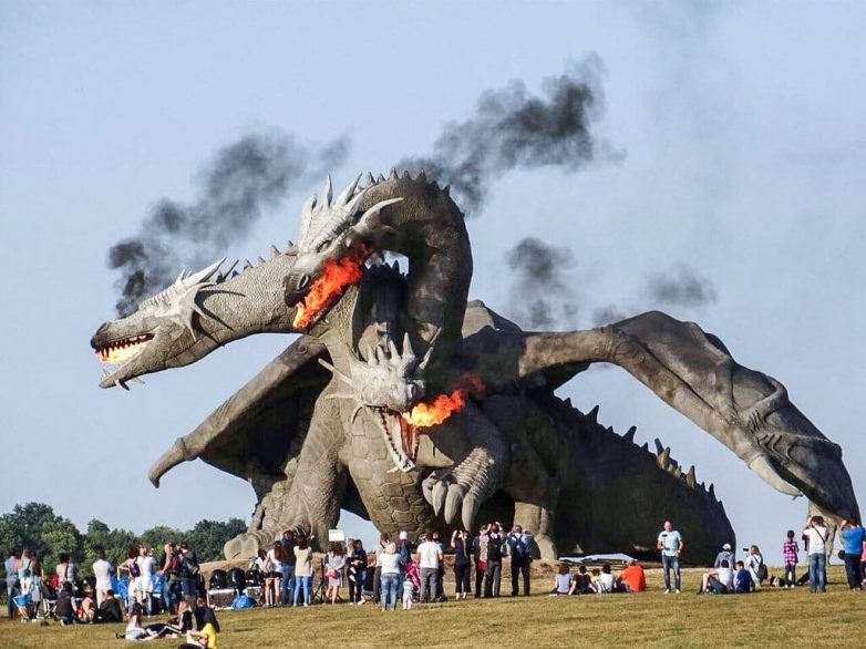 Инстаграм взорвался от восторга по поводу возведения в Липецкой области огромной скульптуры Змея Горыныча. Змей выглядит вполне реалистично с крыльями за спиной и с пламенем, которое извергают его головы. Скульптура стала неотъемлемой частью парка «Кудыкина гора».
