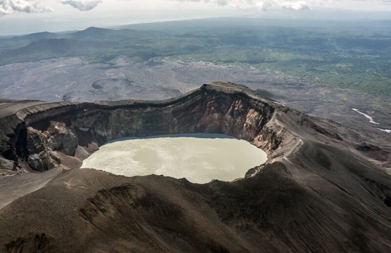 Кальдера — это впадина с крутыми стенками и более или менее ровным дном, образовавшаяся вследствие провала вершины вулкана.