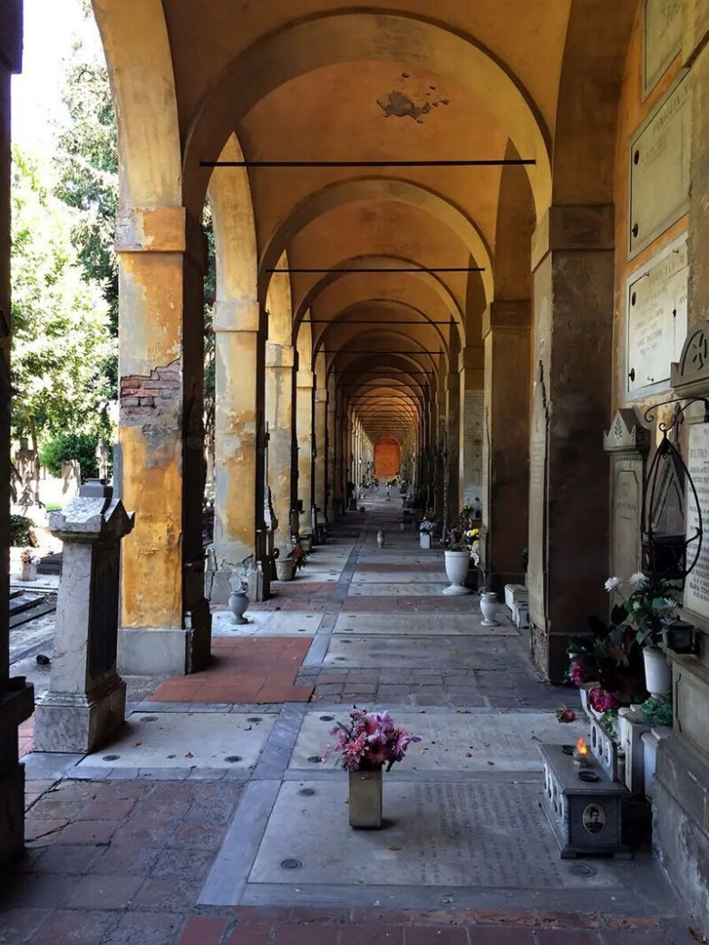Болонья считается городом галерей и аркад — и кладбище Чертоза состоит из рядов галерей, в которых находятся склепы и колумбарии.