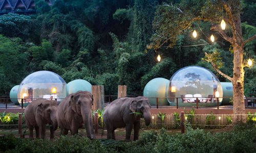 Расположенный в северном Таиланде, Anantara Golden Triangle Elephant Camp & Resort привлекает туристов своими уникальными прозрачными пузырями-люксами, откуда открывается потрясающий вид на район, населенный слонами.