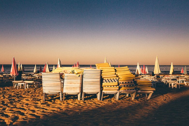 Стопки стульев, скрученные зонты, оставленные вещи — Юлия Галушина фотографировала туристические пляжи на рассвете, в редкий момент тишины и безлюдности.