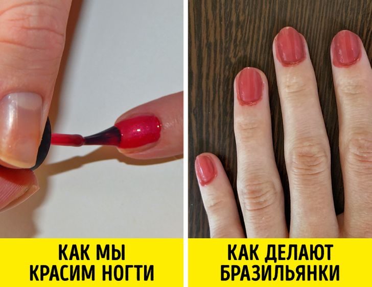 Правда, техника нанесения лака в корне отличается от привычной нам. Покрытие наносится на всю поверхность ногтя и на кожу возле него, после чего излишки с кожи удаляются. Это позволяет прокрасить всю ногтевую пластину, и маникюр в итоге дольше держится.
