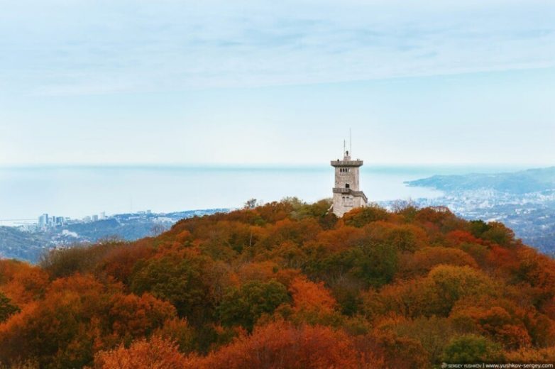 Гора Большой Ахун, на которой располагается смотровая башня собирает много туристов, но сюда стоит поехать и подняться именно на самый верх. Если вы хотите посмотреть на Сочи с высоты, то доступнее места не найти. С высоты открывается вид 360 градусов на море и Сочи с одной стороны, и на горы с другой. Это очень доступная смотровая площадка. От центра Сочи ехать каких-то 40 минут уже с учетом небольших пробок.