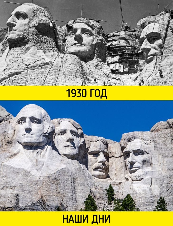 Знаменитая гора Рашмор c 18-метровым барельеф, изображающим президентов США Джорджа Вашингтона, Томаса Джефферсона, Теодора Рузвельта и Авраама Линкольна, приобретала свой нынешний вид с 1927-го по 1941 годы. До этого местные жители называли гору «Шесть праотцов». В 1930 году ее переименовали в честь бизнесмена Чарльза Рашмора — организатора экспедиции и спонсора всех работ по возведению скульптур.