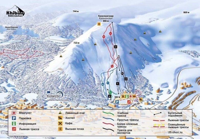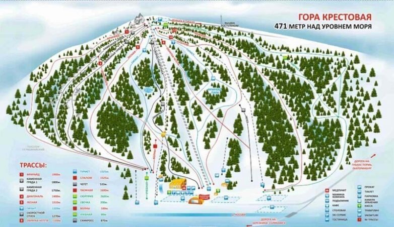 Схема трасс отображает: по 5 зелёных и синих, 6 красных и 3 чёрные трассы.