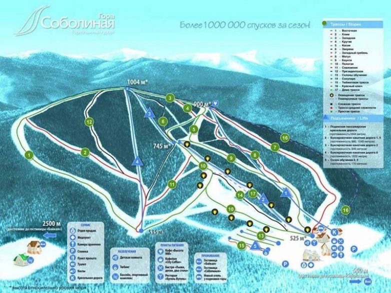 Карта трасс описывает состояние склонов, 13 трасс, подъёмников. На заметку туристам: