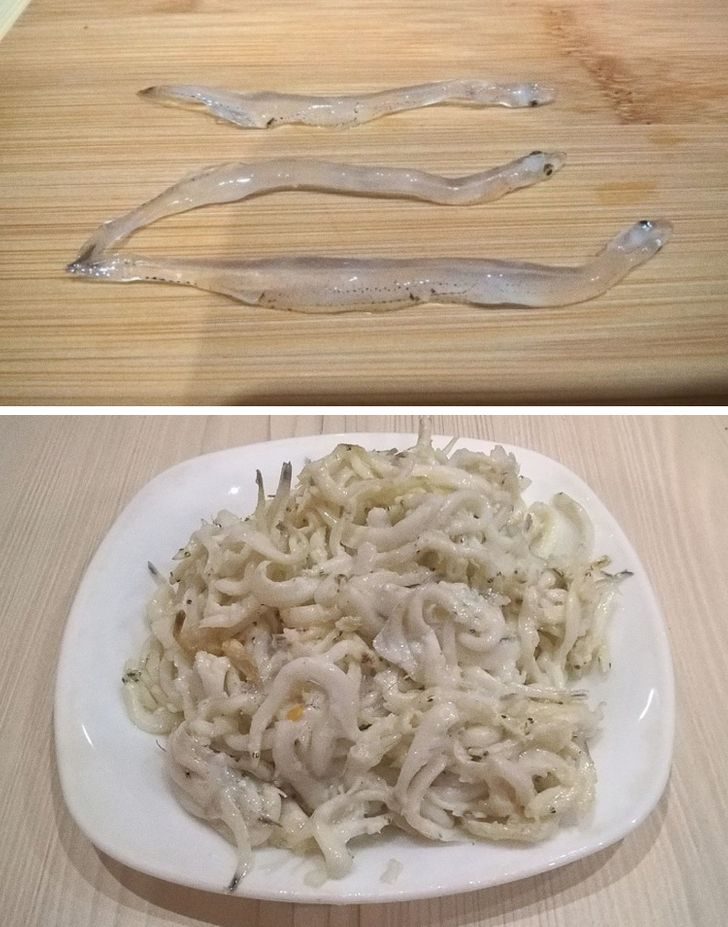 «Даже не подозревал, что такая существует. Попалась мне эта диковинка совершенно случайно: в субботу на рынке у рыбного прилавка стояли 2 пенопластовых контейнера с искрящейся на солнце студенистой массой и рыбным ароматом. Делюсь собственным опытом. Рыбу пожарил. Ни соли, ни перца, ни каких-либо иных специй добавлять не стал: решил попробовать чистый вкус. Готовое блюдо внешне напоминает тарелку лапши. Вкус тоже „лапшичный“, с рыбным привкусом и едва заметной „сластинкой“. Можно еще сбрызнуть соевым соусом. Я проверял: вкусно».