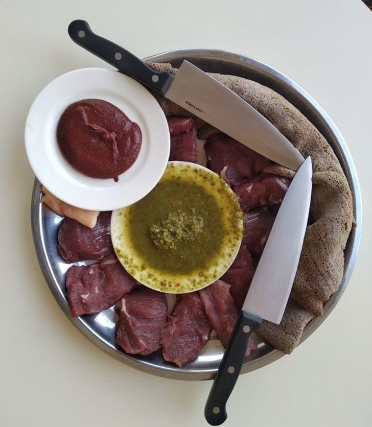 Это обязательное блюдо на фестивалях, любых семейных мероприятиях, свадьбах. Сырое мясо подается с эфиопскими лепешками инджера и острым соусом (микс масла и красного чили). К нему подают также смесь специй, приправу чатни из зеленого чили с солью. Каждому, кто будет пробовать, выдается острый нож, чтобы разрезать мясо и обмакивать его в специи. © Umar Sheriff Habibullah / Quora
