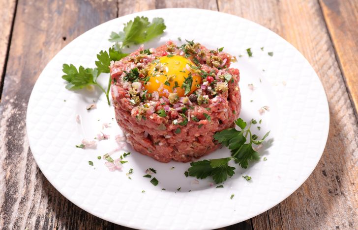 «Я ел много диковинных блюд, но самый запоминающийся ужин был в Париже. Стейк тартар — это кусок свежего сырого говяжьего фарша с сырым яйцом и приправами. Вот как это выглядит»