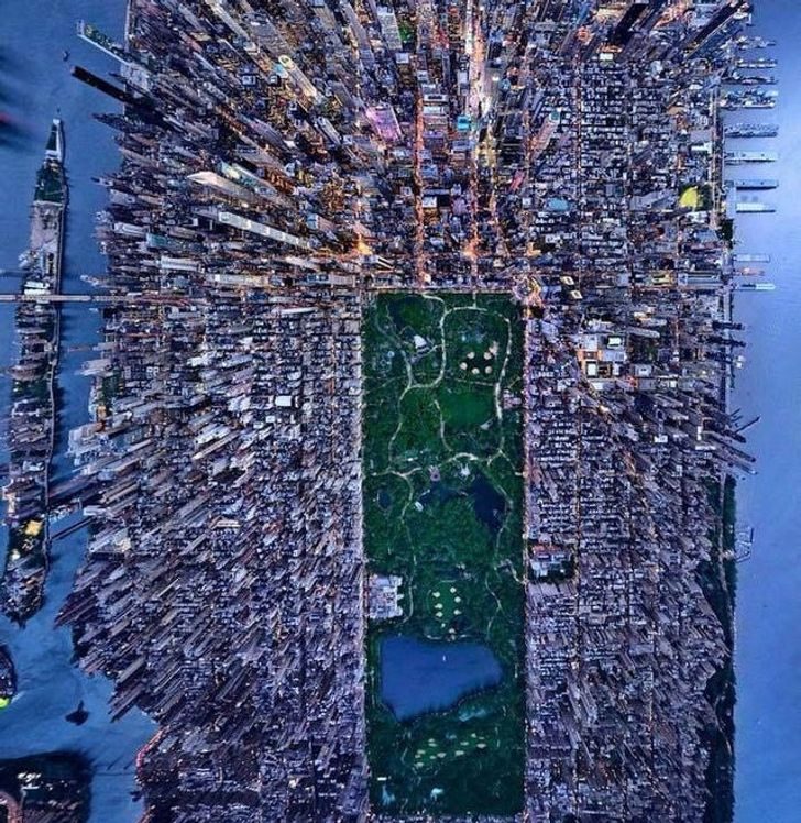 Вид с воздуха на Нью-Йорк — копия системного блока с материнской платой в центре