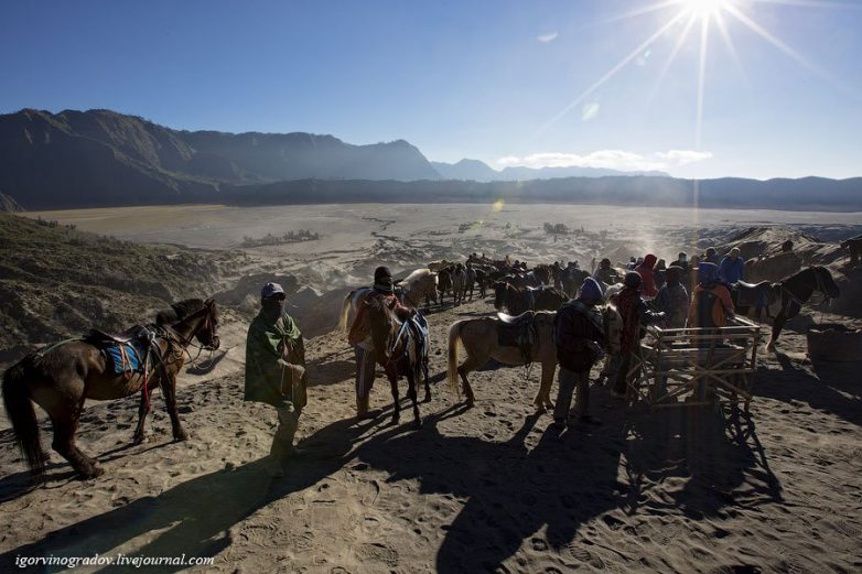 Туристы наслаждаются эксклюзивными видами на вершине, а скакуны ждут работу у подножия вулкана, отвезти тех, кто не свалился в кратер и спустился с горы, обратно к джипам:
