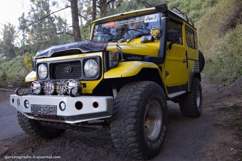Полюбовавшись рассветом, мы отправляемся к подножью вулкана Бромо. Большая часть дороги разбита, так что только на джипах и можно туда прорваться. По булыжникам трясёт как на телеге с деревянными колёсами. Французу, сидевшему рядом, повезло больше всех, он не только полюбовался красотой индонезийской природы, но и заработал на память большую и красивую шишку на лбу.
