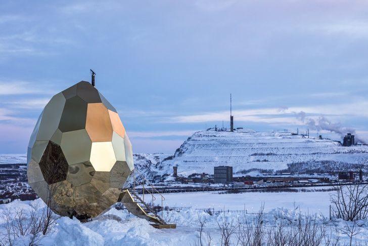 Необычная сауна в форме 5-метрового золотого яйца построена из дерева и стальных панелей и вмещает 8 человек. Внутри находится дровяная печь. «Яйцо» можно легко разобрать и перевезти в другое место, например оно побывало в Париже, где посетители могли сами испытать ее, но постоянное его место — городок Кируна, где оно также служит арт-объектом и достопримечательностью, привлекающей туристов.