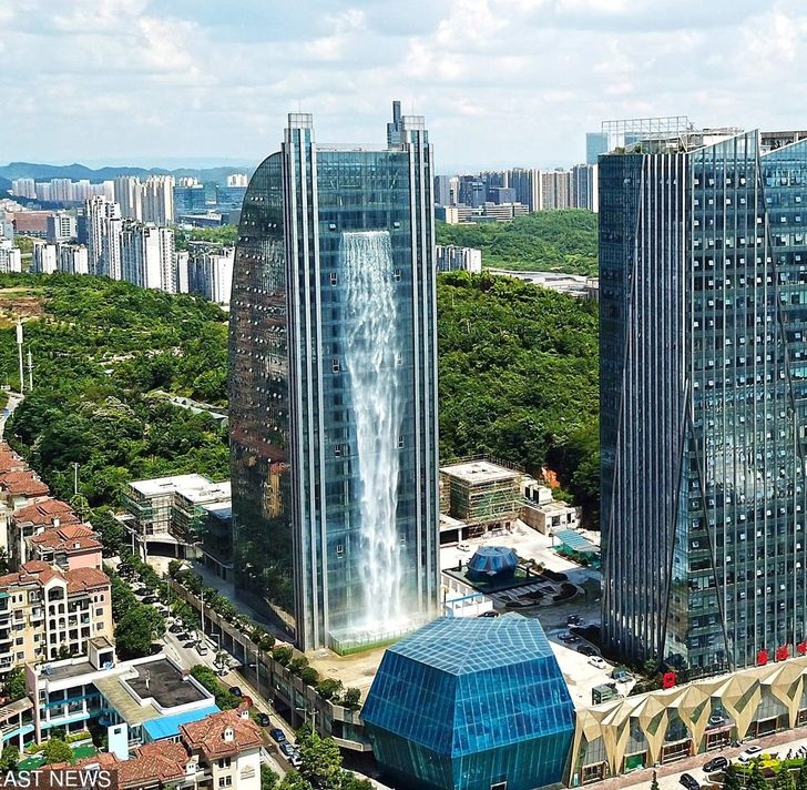Когда вдоль стены 121-метрового небоскреба в китайского городе Гуйян хлынул поток воды, местные жители подумали, что произошла авария на водопроводе, и начали сообщать об этом в СМИ. Но беспокоиться было не о чем: на самом деле городу впервые продемонстрировали один из самых высоких в мире искусственных водопадов. Необычным видом льющейся со 108-метровой высоты воды можно полюбоваться лишь по особым случаям, ведь 1 час работы сооружения обходится в $ 100.