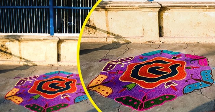 В некоторых индийских штатах (например, в Тамилнаде, Карнатаке) можно увидеть затейливые рисунки на асфальте, белые или цветные. Они называются колам и несут в себе не только эстетический смысл. Обычно их рисуют женщины перед входом в дом для символического приветствия богини Лакшми, которая символизирует богатство и процветание.