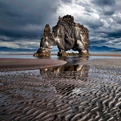 Исландия. Побережье залива Хуна. Мистическое каменное изваяние в лучах заходящего солнца кажется монстром, наклонившимся к воде — это скала Хвитцеркур (название можно перевести как «белая рубашка»).