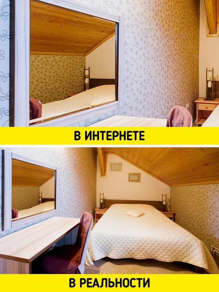 Еще одна хитрость администрации — сделать фотографии на широкоугольную камеру. На таких снимках комнаты кажутся просторнее, чем есть на самом деле, поэтому будьте готовы, что в реальности номер будет меньше.